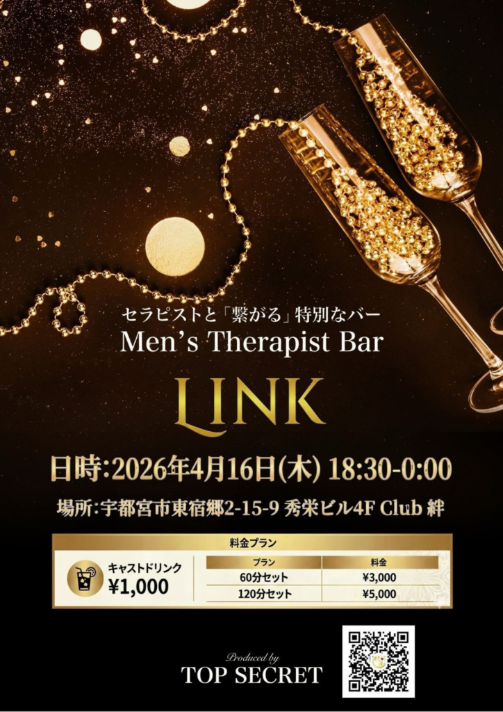 第2回目の開催となるセラピストと繋がる特別なバー、Men’s Therapist Bar『LINK』が4月16日18時30分からオープンいたします🍸